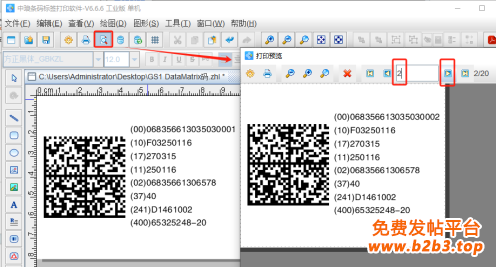 4. 排版设置好后,点击软件顶部的“打印预览”按钮,翻页查看批量生成GS1 DataMatrix码,我们可以看到二维码右侧可读数据和二维码中数据是一一对应的。预览无误就可以直接连接打印机打印出来或者批量输出PDF文档、图片、TIF文档了。