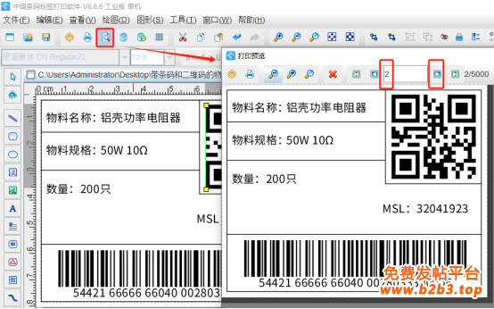 4. 制作完成之后,点击软件顶部的“打印”按钮,在打开的窗口中设置数据量5000,开始页码为1,点击结束页码后面的尾页,然后点击下面的“预览”按钮,翻页查看批量生成的物料标签,预览无误就可以直接连接打印机打印出来了。