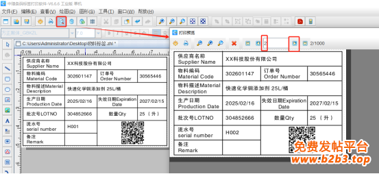 4. 制作完成之后,点击软件顶部的“打印预览”按钮,翻页查看批量生成的物料标签,预览无误就可以直接连接打印机打印出来了。